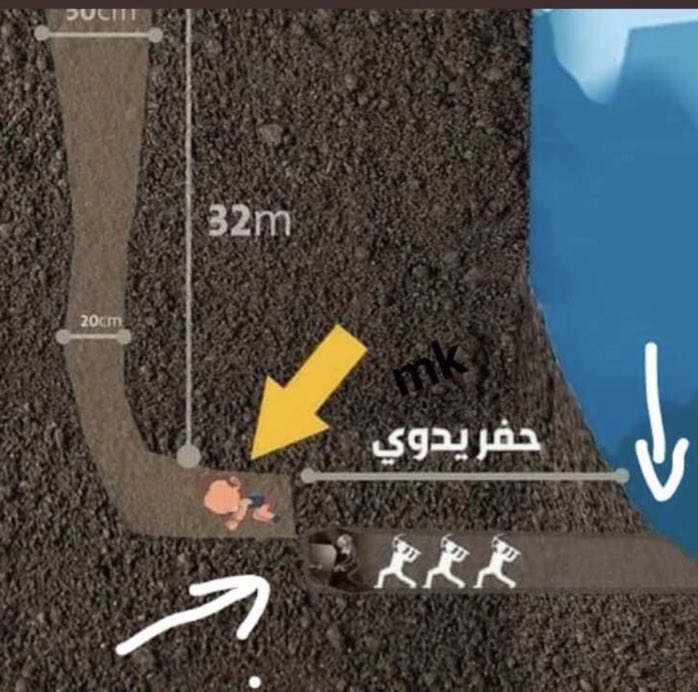 استخدام جهاز حديد وأنابيب خرسانية لإعادة أعمال الحفر اليدوي لإنقاذ الطفل