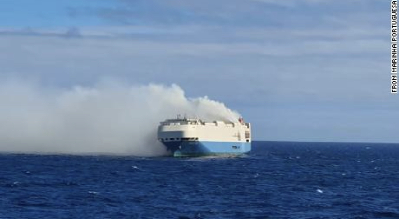 تطفو سفينة شحن مهجورة مليئة بالسيارات في المحيط الأطلسي، بعد ان اندلع حريق سريع متنها أجبر الطاقم على تركها والفرار.