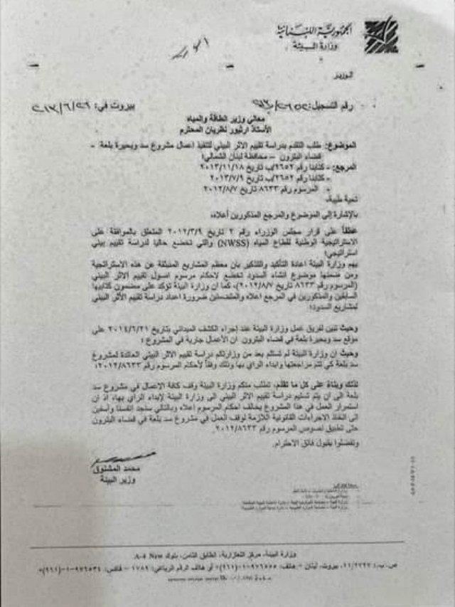 وأضاف، ومرفق ربطاً كتاب موجه من وزير البيئة الى وزير الطاقة بيطلب منه إيقاف الأعمال فوراً احتراماً للقانون وايضاً تمردت وزارة الطاقة والمياه واستكملت الأعمال وهون الكارثة: طلع بالموقع في بالوعين ٤٠ هوة.