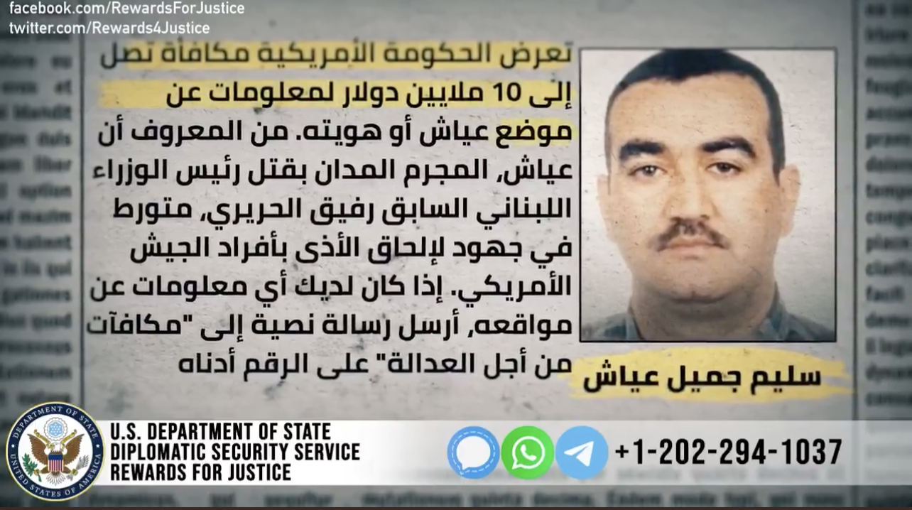 نشرت الحكومة الاميركية بيان عرضت فيه مكافأة مالية تصل الى ١٠ ملايين دولار اميريكي مقابل معلومات عن سليم عياش الذي تعتبره الولايات المتحدة ارهابي تابع لحزب الله اللبناني، وذلك لتورّطه في عمليات تهدف الى الحاق الاذى باميركيين. ونشرت البيان مجموعة “مكافآت من اجل العدالة” على تويتر وجاء فيه “انتباه! تقدم حكومة الولايات المتحدة الأميركية مكافأة تصل لـ10 ملايين دولار مقابل معلومات عن ارهابي #حزبالله #سليمعياش لتورطه في عمليات تهدف الى إلحاق الأذى بأشخاص أمريكيين. راسلنا عبر تلغرام أو سكنال أو واتساب: 0012022941037
