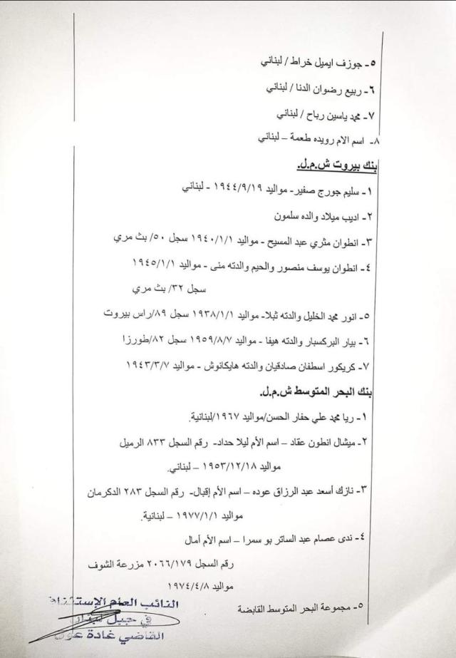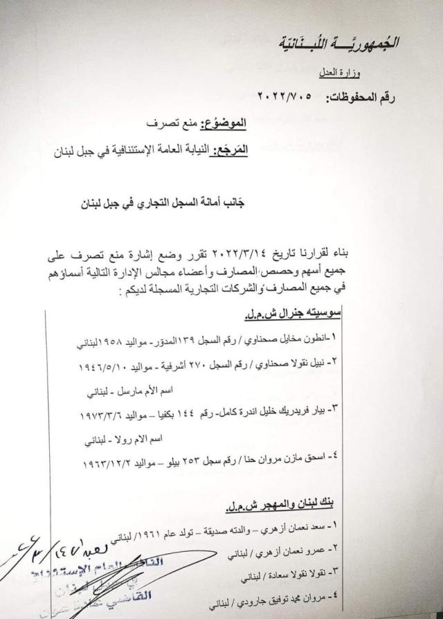 اصدرت النائبة العامة الاستئنافية في جبل لبنان القاضية غادة عون قرارا، قضى بقيد اشارة منع تصرف على العقارات والسيارات والمركبات والأسهم والحصص في جميع الشركات التجارية العائدة لمصارف بنك بيروت، بنك عودة، بنك لبنان والمهجر، بنك البحر المتوسط وبنك سوسييته جنرال، كما على العقارات والسيارات والمركبات والأسهم والحصص في جميع الشركات التجارية العائدة لرؤساء مجالس وأعضاء مجالس إدارات هذه المصارف.